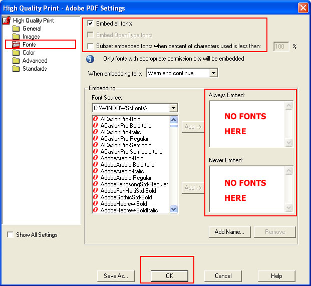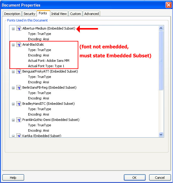 A: In Acrobat open your PDF file. Go to File>> Properties>> Fonts tab. Make sure the fonts are embedded.